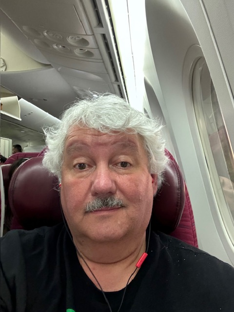 The food was good and imaginative. The stewardess says she loves sweats, and I have a strange bread pudding for my first meal. It is excellent, and there are two full meals and one breakfast. Perfect. My seatmate, one over, slept most of the trip, and we used the spare seat for storage and glasses. The beer and wine were free; I had a Stella to remember Susie, one of her favorites. I watched three movies. I slept most of Wonka away as I had enjoyed it in theaters. The 350 Engine noise is problematic; I can barely hear or understand the movies and the staff. The entertainment center allows for pairing headphones. Next time in Qatar Airlines, I will bring noise-reducing headphones.