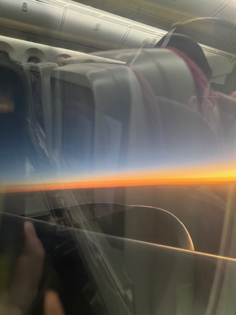I watched the sunrise from the plane and then got to walk off the plane, after waiting for first and business class, in my socks. I was stiff. This is a tarmac landing, so we get off the plane on the big stairs, and then a bus takes you forever, it seems, to the terminal.