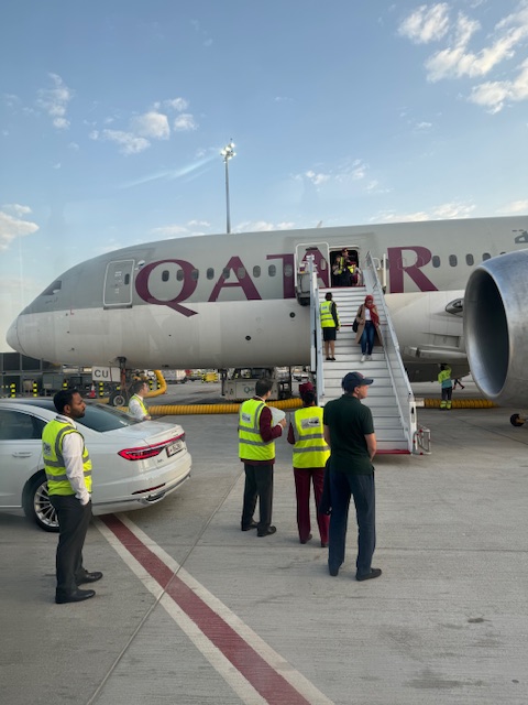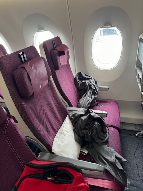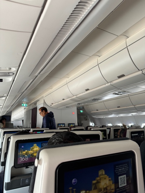 Soon, I will wait with everyone else for Business and First Class, and then we will finally be allowed on the plane. This time, I will be in the back of the plane, 37A, and the seat between me and a nice Indian man (his family has the center seats) is empty! The Airbus 350 Qatar Airlines plane is comfortable, and the legroom is good in the cheap seats, if not excellent. There are also plenty of restrooms. The 787 from Casablanca had me wedged into my seat and was full. I dreaded the 17 hours after a miserable 7 hours on the 787, but the 350 was an excellent ride, more like a busy hotel lobby with food and assigned seats.