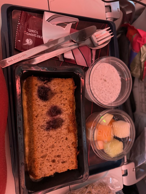 We, like all my flights, were delayed by twenty minutes, and I do remember leaving the gate, but next, I woke to my surprise, already flying–I had never slept through a take-off until now. I sleep a few more times but get some coffee.