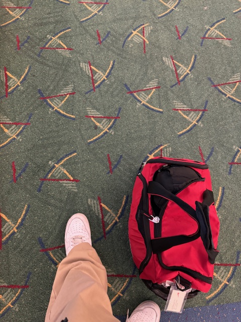 The cement pad was rough and hurt through my socks. The bus ride was short, and I stepped on more rough cement and cement floors. I sat in the first chair near an escalator packed with people from various planes. I also find a men’s room.