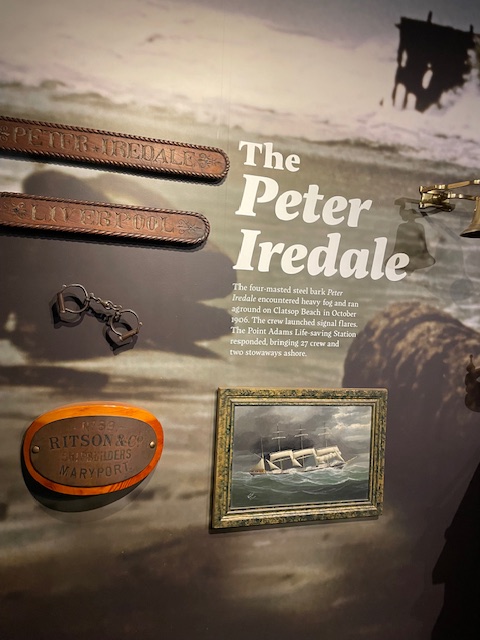 I looked at the shipwreck display, which was updated with a new wreck that has happened since I moved here, the New Carissa. The recovered compass, builder plate, and some lights from the ship are on display. Also, a vast burned board of the ship’s name, also salvaged, is displayed. Because of the cold water and the rough seas, most wrecks include a significant loss of life. The remains of the wrecks, including part of the Exxon Valdez’s hull (I have a bottle of oil from the wreck I bought in Alaska years ago), are respectfully displayed.