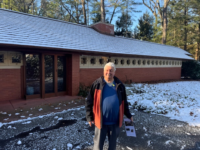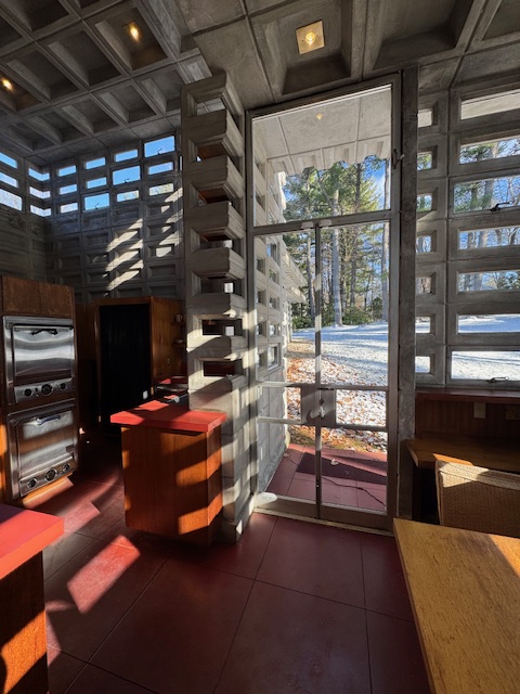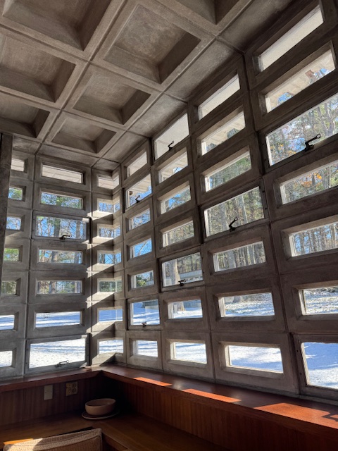 Clint finds me at the hotel at 8:45, and we discover that there is 1/2 half an inch of snow in Manchester, and we are thirty minutes early. We tried a nearby cafe that looked well-rated, but after driving there, we discovered they’re closed for the holiday week. We return to the Currier Museum of Art, which uses their shuttle to take us to their Frank Lloyd Wright houses.
