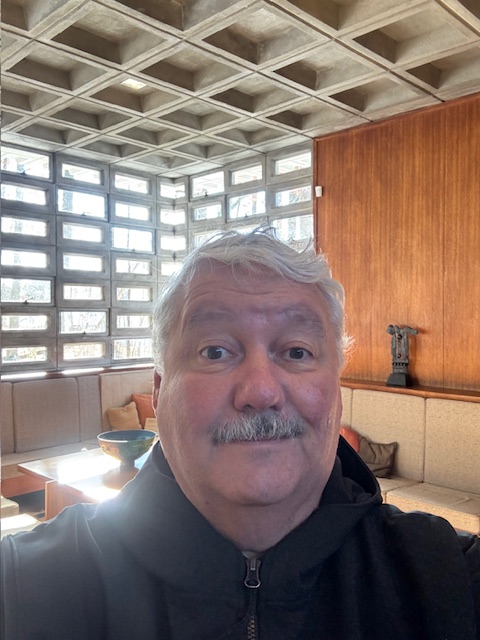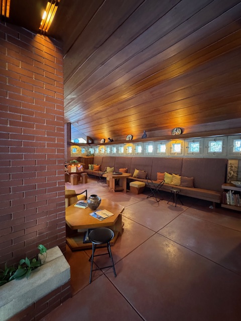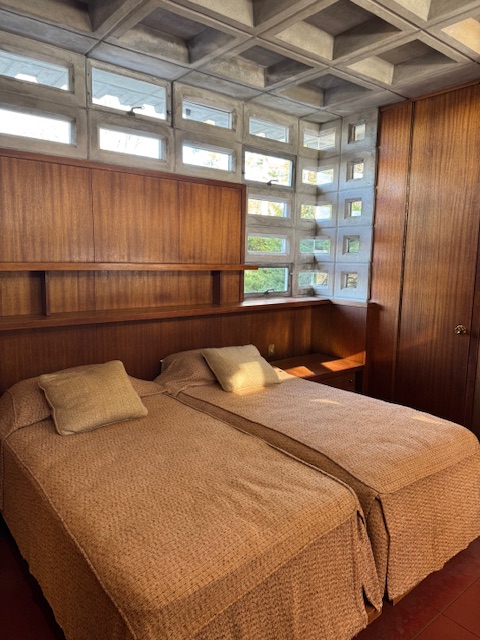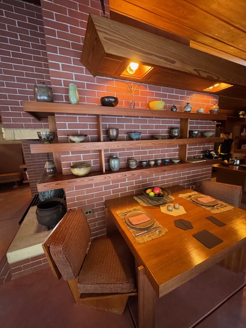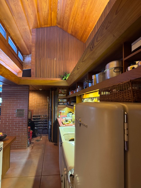 Toufic H. Kalil House was purchased by a gift to the museum in 2019, when someone on a tour saw it was for sale and decided to cover the acquisition (we learned it was about $700K and needed work). It is a kit house made of cement bricks and a flat roof of cement too. The roof leaked as some of Frank Lloyd Wright’s inventions faltered. Also, the tolerances were too tight, and much of the work was repeated, driving the initial cost from $25K (in the 1950s) to over three times that. This house, one of the last, is an attempt to build a home that could be built for a reasonable price and with all the modern conveniences (including a top-loading dishwasher), and is one of the few Unosian Automatic houses.