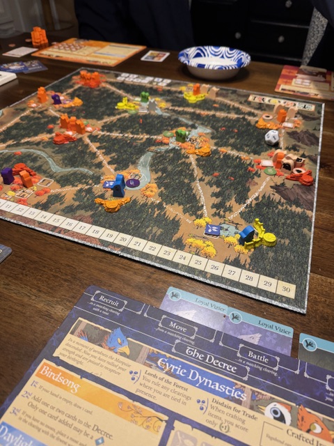 I reboarded the rental and took it on the now familiar twenty minutes to Clint’s and Annika’s place. Misha, Hope, and their girls (who said hello to me a few times) were here. Soon, some food was delivered by the Gaming Night folks (the house was filling up), and Misha beat me at Tiny Epic Galaxies. Later, after pizza, Clint, I, and five others tried out Root. It was messy and took until 11. The Woodland Alliance (‘Toast’) won as the player knew the game, beat on my faction (the only other player who could play), and the others (despite my pleas) just tried to run their confusing factions. The Toast just exploded and ran away with the game. What I have seen in many games is that when The Woodland Alliance or Lizards get a foothold that is not challenged. Root is a complex game, as every faction is running its own game while all play out on the same board. Root is competitive, mean (there are only so many resources that need to be snatched up), and demands conflict. When played right, a sudden victory after everyone pushes and punches to a good score is the usual. I scored zero (don’t laugh). Still, it was fun.