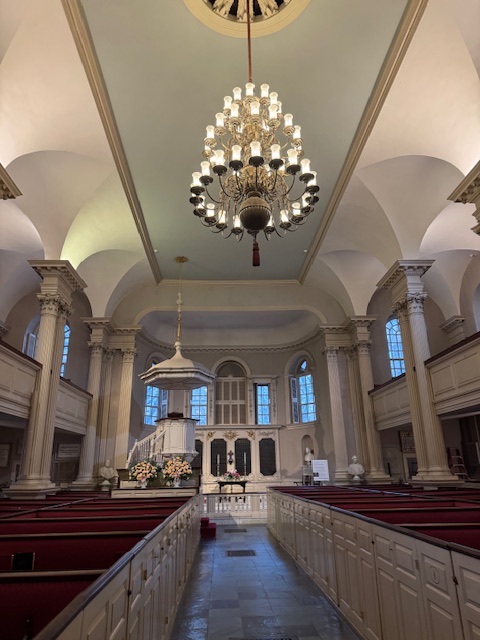 I thanked her and hoped to be back (the rain turned heavy, and I returned, soaked, to my hotel room instead). King’s Chapel, built in the 1600s, was open for music today. I walked the short distance there and was happy to find the church was well-heated. I donated the recommended $5 to the player and spent thirty minutes walking around the building. There were informational signs in place, and I did my self-guided touring, which today would be about. The pews are boxes, like in the Old Meeting House, and families rented them. Paul Revere’s 33 box was near the Governor’s, and the bell was made in his shop (though not by him). He described it as some of their best work, with a “Sweat” sound. One pew box was from the judge who ruled on Dred Scott. Another Wordsworth mentioned his distaste for abolitionists. George Washington had sat in the Governor’s Pew during a concert.