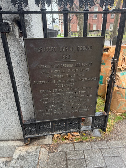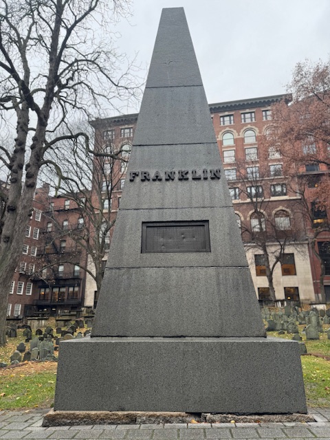 I walked, in the increasing cold and rain, to the graveyard I had seen earlier. It holds the graves of Franklin’s parents and many other Founding Fathers, including John Hancock and Samuel Adams. I was cold and wet too, and I quickly walked out.
