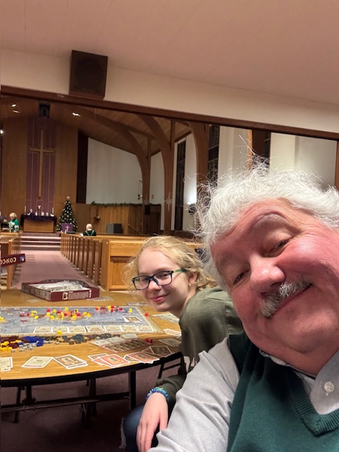 I parked Air Ford (Escape) near the Beaverton Food Carts and walked a few wet blocks to Central Taps. I got a beer, a Harp–a favorite from Ireland, and set up the Decision Games’ Siege of Jerusalem 70AD wargame. I am playing this with Michael R on Monday and still trying to understand the setup and tactics. I also wanted to see if the place would work for gaming. The dark rainy sky and mood lighting meant the place was too dark for me to read the tiny print on the pieces. I used my phone light to see the pieces.